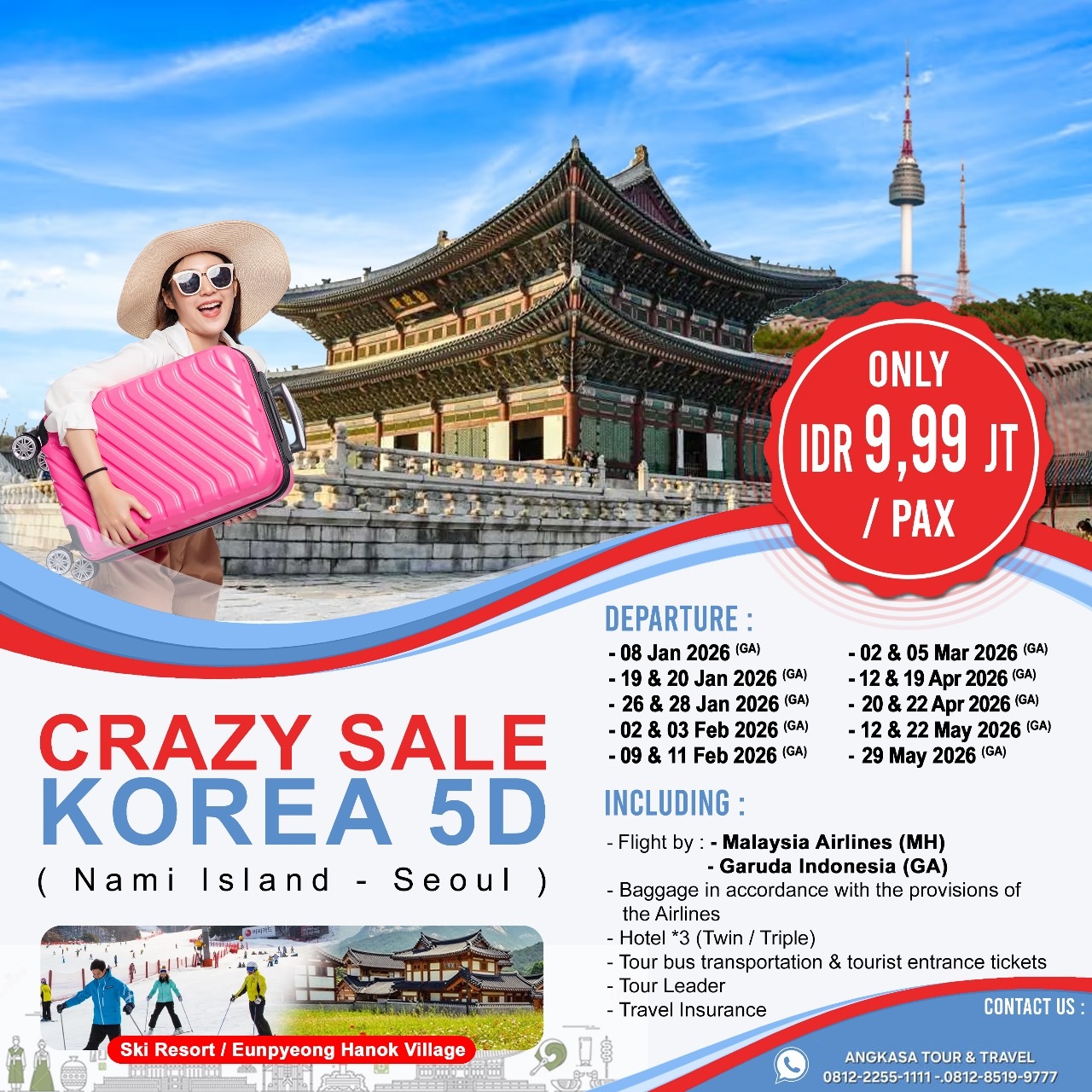 Setiba di Incheon disambut Guide berbahasa Indonesia yang ramah, kita akan ke mengunjungi Ski Resort -Periode Februari 2025(Tidak termasuk pakaian dan perlengkapan ski) atau kita akan mengunjungi Eunpyeong Hanok Village-Periode Maret-November perpaduan pemandangan alam dan rumah tradisitional Korea yang indah. Kemudian menuju Nami Island yang merupakan tempat syuting “Winter Sonata” serial drama Korea yang mendunia. Dilanjutkan menuju Gangnam COEX Mall dimana kita dapat berbelanja oleh-oleh disana, disini terdapat Starfield Library, tempat syuting banyak drama Korea dan Gangnam Style Statue. Setelah itu, Check in hotel istirahat.