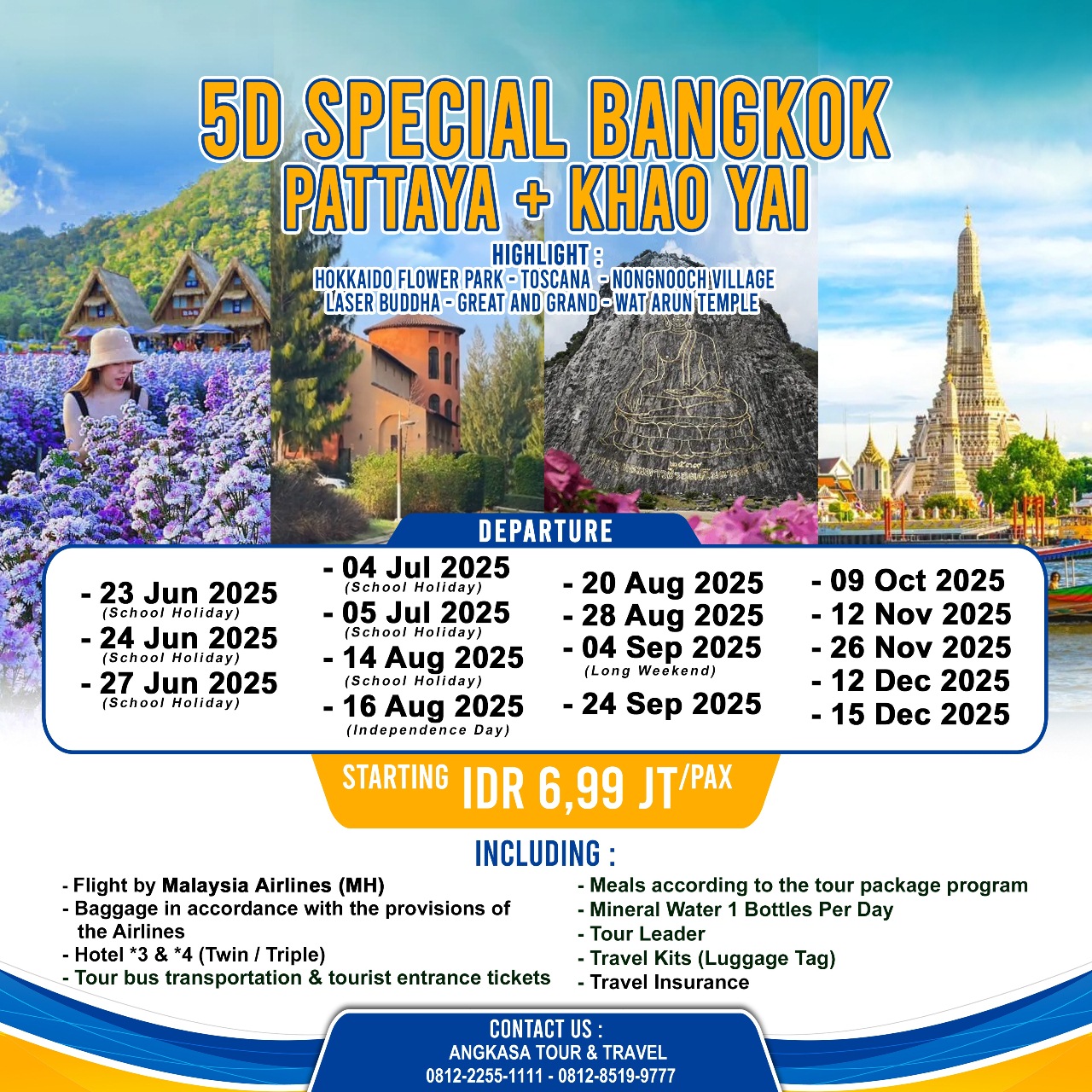 Setelah sarapan pagi. kita akan mengunjungi Khao Yai, Hokkaido Flower Park, Toscana untuk berfoto stop (tidak termasuk Minuman dan Coffee), kemudian kita akan menuju Ban Mai Chay Nam untuk makan siang (dengan Musium Mainan), dilanjutkan menuju Tokyo Farm sebelum kembali ke Bangkok, Kita juga akan berbelanja di Jodd Fairs Night Market.Kemudian kembali ke Hotel. Bermalam di Bangkok.