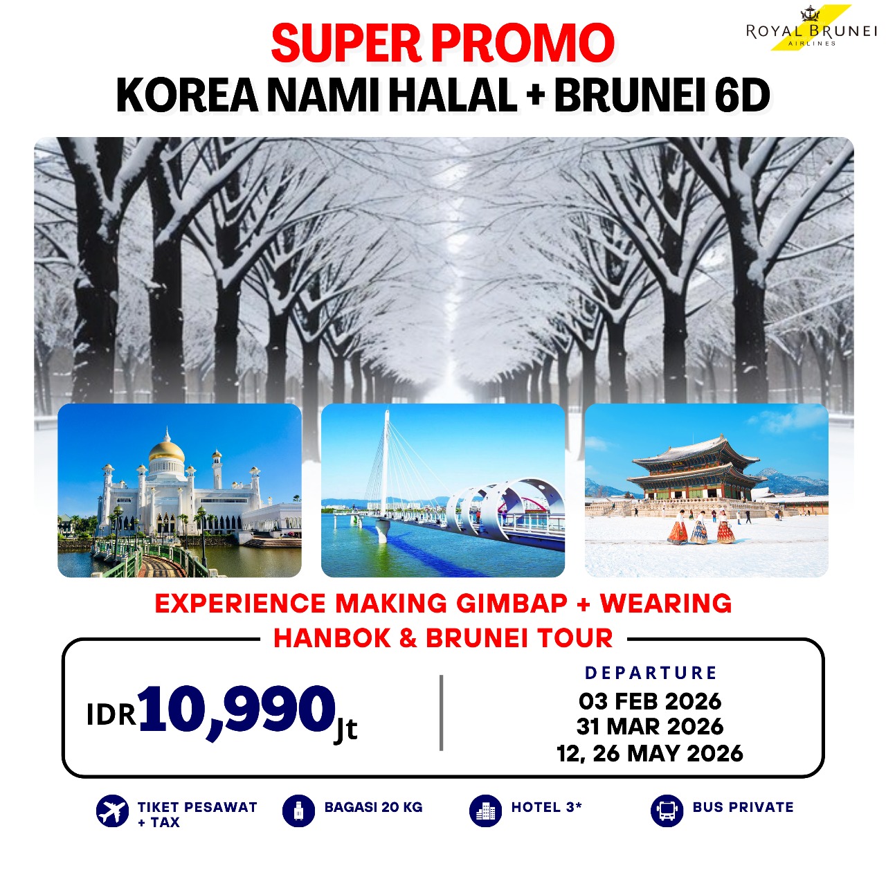 Highlight : Halal Meals| Tour Leader Muslim Berpengalaman | Mengunjungi 2 Negara Sekaligus | Mengunjungi Masjid Omar Ali Saifuddien | Explore Brunei Kampong Ayer with boat | Soyanggang Sky walk Glass bridge | Nami Island | Gyeongbokgung Palace | National Folk Museum | Itaewon Grand Mosque | Itaewon Street | N-Seoul Tower with ev Bus | Gimbap Making + Hanbok Wearing | Dongdaemun Market | Myeongdong Street | Lotte Mall | Byeolmadang Library + Ktown 4U | | Brunei Fullday Tour |