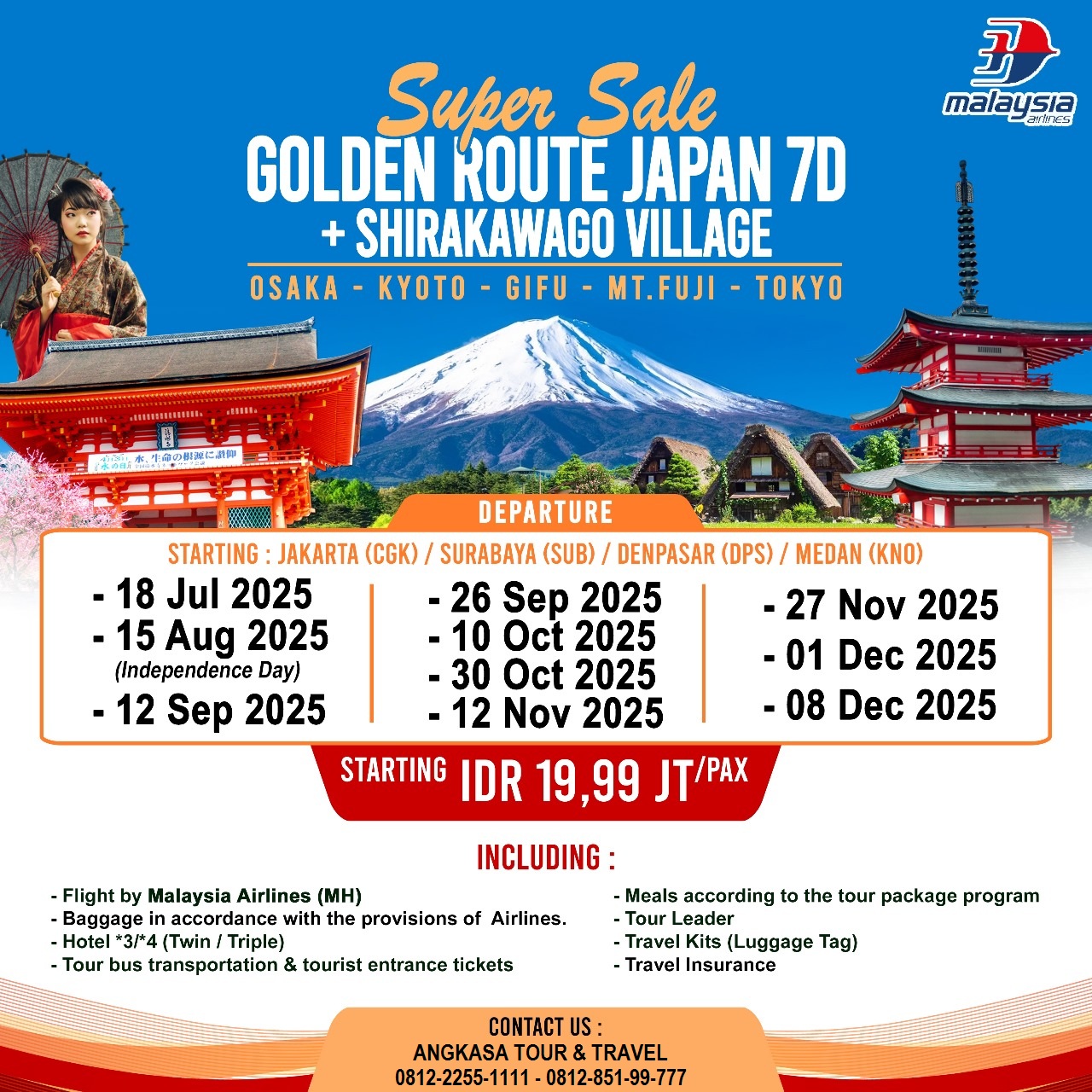 DAY 7: OSAKA - XHANEDA- JAKARTA (meals on board) MH53 KIXKUL 0955 1545 MH725 KULCGK 1750 1905 Hari ini kita akan melakukan perjalanan ke bandara Soekarno HaƩa Jakarta. Sampai jumpa di perjalanan bersama kami selanjutnya. Terimakasih