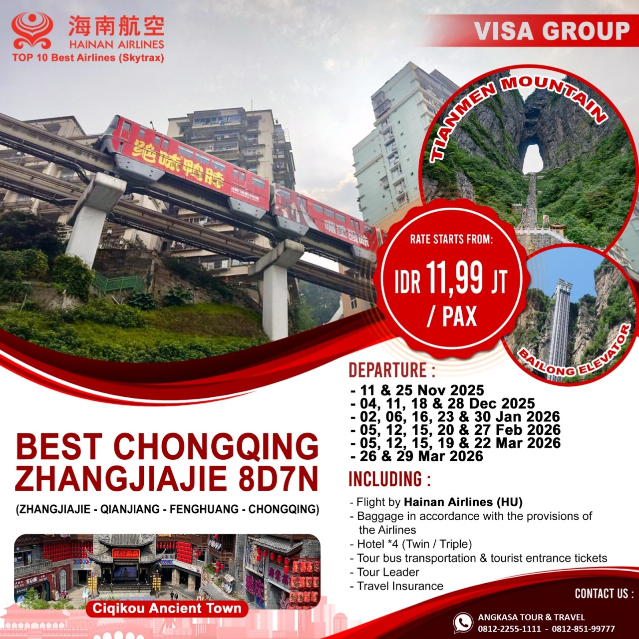 Setibanya di Chongqing, peserta akan diajak menjelajahi pesona kota yang dikenal sebagai Mountain City. Perhentian pertama adalah Ciqikou Ancient Town, kawasan kota tua yang disebut sebagai “fosil hidup budaya Chongqing”, di mana peserta dapat menikmati suasana tradisional, mencicipi camilan khas, dan melihat berbagai toko teh serta kerajinan tangan lokal. Selanjutnya, menikmati pemandangan malam Hongyadong (Hongya Cave) — kompleks bangunan bertingkat dengan ribuan lampu berwarna-warni yang menciptakan suasana magis seperti di dunia mimpi. Kemudian mengunjungi Kui Xing Tower, menara bersejarah bergaya arsitektur khas Tiongkok yang menawarkan panorama indah kota Chongqing dari ketinggian. Setelah itu, peserta diantar menuju hotel untuk check-in dan beristirahat.Bermalam di Ivan Hotel or Gillet Hotel **** / Similar