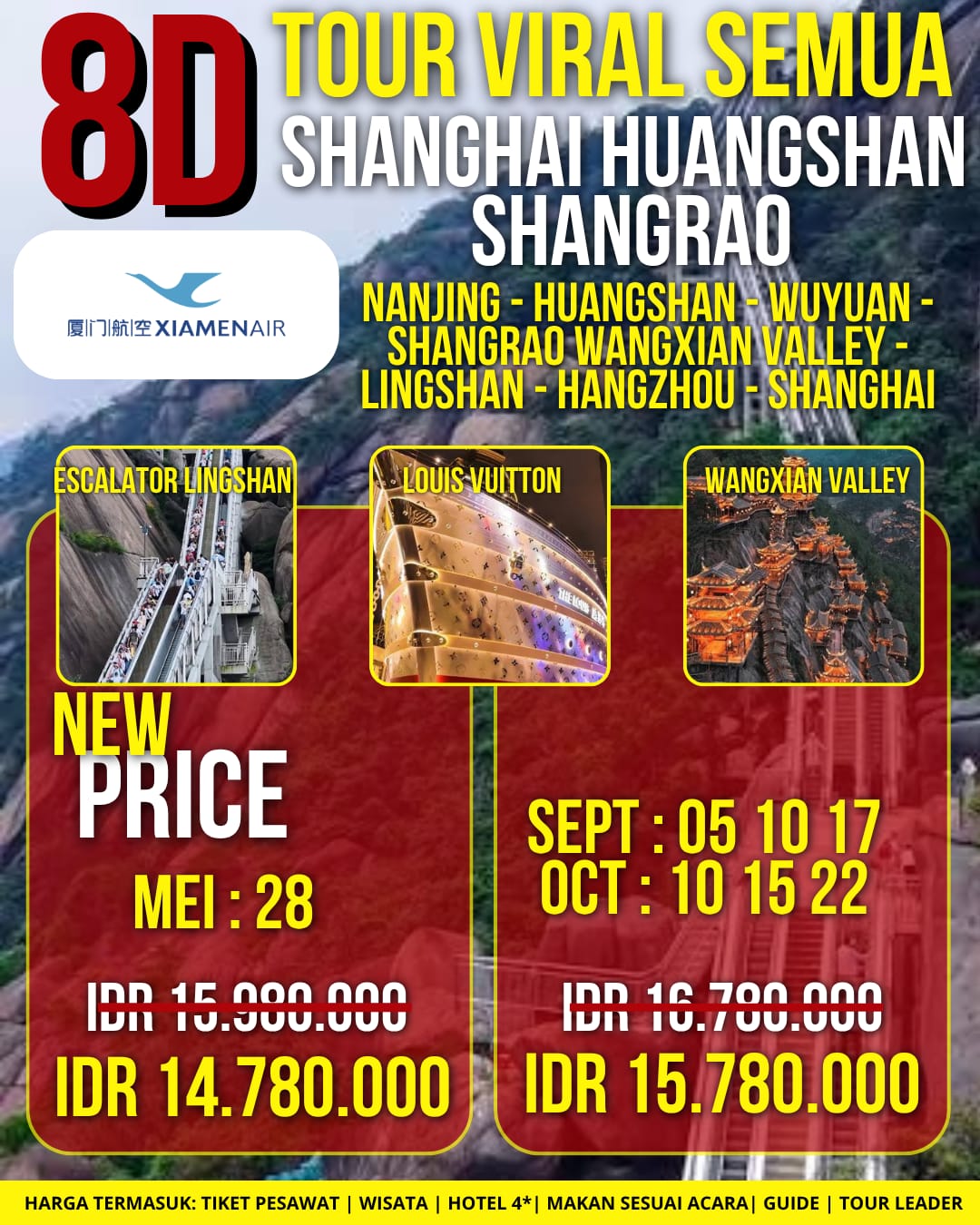 Pegunungan Huangshan Includes Cable Car & Battery Car, Desa Huangling, Wunvzhou Resort, Menara Baoyu, Gunung Lingshan, Wangxian Valley, West Lake, Hefang Street, Old Shanghai Street (Nanshi), Chenghuang Miao, The Bund, Tongrentang, Nanjing Road Pedestrian, Starbucks Reserve Roastery & The Louis Vuitton Shop, Nanjing Deji Plaza.