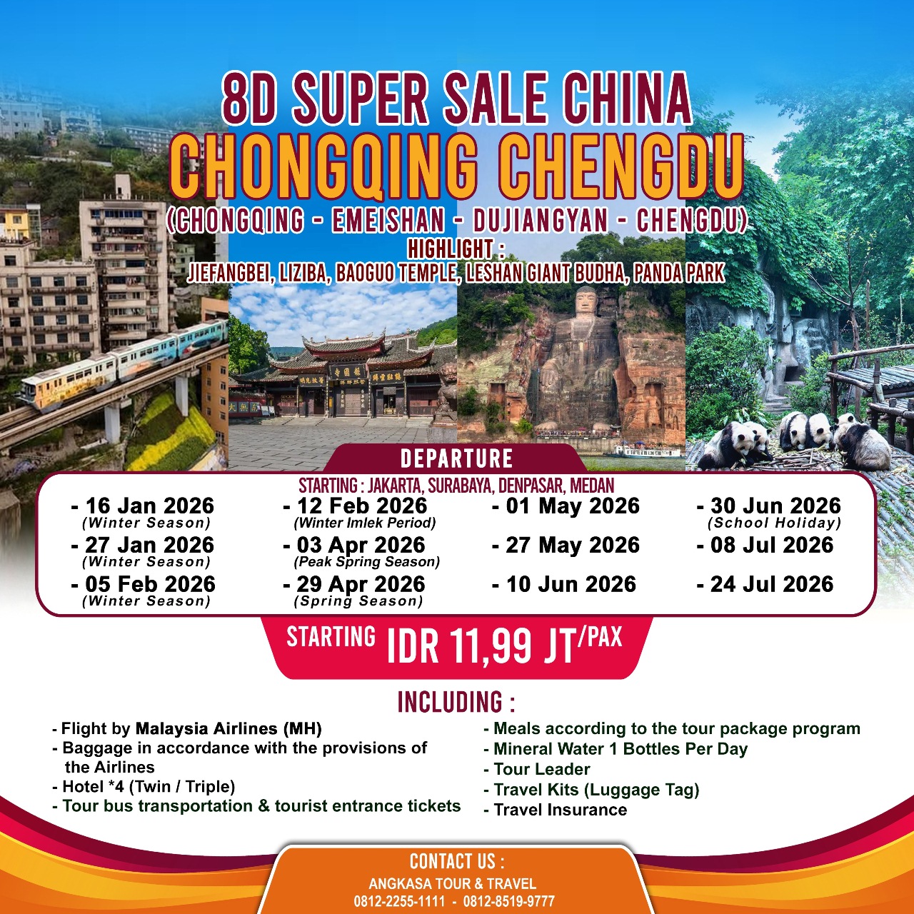 Sarapan pagi di hotel, Perjalanan diawali menuju Zhongshuge sebuah toko buku ikonik yang terkenal dengan desain interiornya yang unik dan artistik, cocok untuk menikmati suasana santai sambil mencari buku-buku menarik. Setelah itu, kunjungi Panda Yangtian Square, sebuah tempat yang ramai dan penuh kehidupan di pusat kota, dimana Anda bisa merasakan atmosfer lokal dan melihat patung panda ikonik yang menjadi simbol kota Chengdu. perjalanan dilanjutkan ke Guanxian Ancient City, sebuah kota kuno yang menawarkan pesona sejarah dan budaya tradisional yang kental, dengan bangunan berarsitektur klasik yang membawa Anda seolah kembali ke masa lalu. Kemudian, nikmati waktu di Jinli Ancient Street, jalan bersejarah yang dipenuhi dengan toko-toko suvenir, jajanan tradisional, dan pertunjukan budaya yang hidup, menjadikannya tempat yang sempurna untuk berburu oleh-oleh dan merasakan kehangatan budaya Sichuan. Selanjutnya kita akan menuju bandara untuk penerbangan kepulangan.